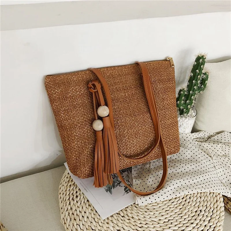 Best Women Simple Straw Handbag Shoulder Bag Tassels Tote Summer Beach Zipper Shopping Crossbody Fashion